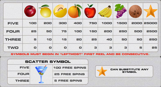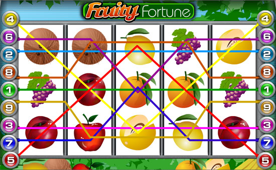 The objective of Fruity Fortune is to match the symbols of each one of the five reels to a winning combination. This is a five reel multi-pay line slot game which has 9 pay lines. Payouts depend on what symbols will match on a line.