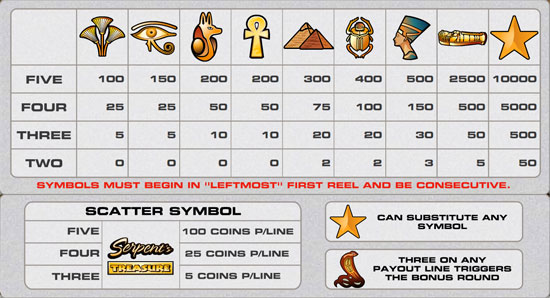 The objective of Serpent's Treasure is to match the symbols of each one of the five reels to a winning combination. This is a five reel multi-pay line slot game which has 9 pay lines. Payouts depend on what symbols will match on a line.